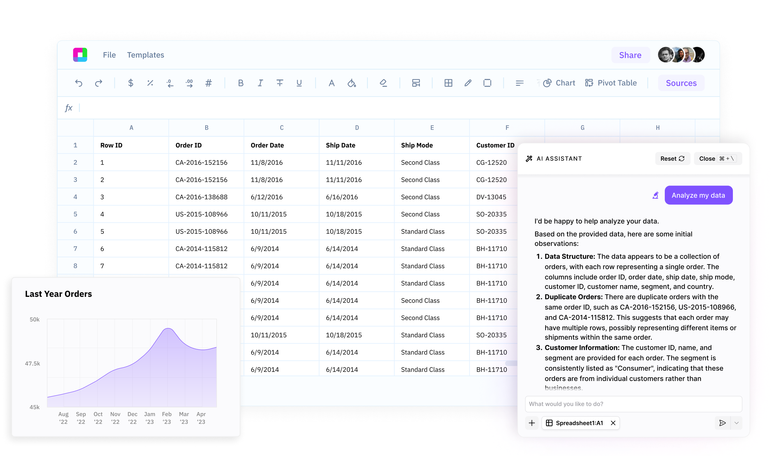 Access powerful AI data analysis without leaving your spreadsheets. Insights and recommendations are just a click away, streamlining your data workflow.
